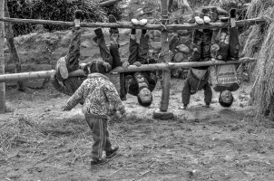 2011年9月30日拍摄于甘肃省宕昌县兴化乡磑子坝。在晾麦架上喜玩的孩子们。