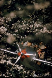 在樱花盛开的时节,一个小男孩乘坐飞机 玩具穿梭于花丛之中。奈良,日本。1961.