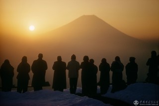 朝圣者在日出时赶到富士山,日本富士山。1961