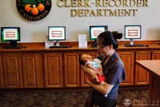 洛杉矶橙县法院内,一个新生儿的姥姥抱着刚刚宣誓成为美国公民的婴儿准备离开。