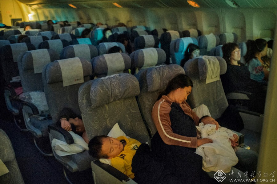 一个坐完月子的中国孕妇带着孩子在回国的飞机上。