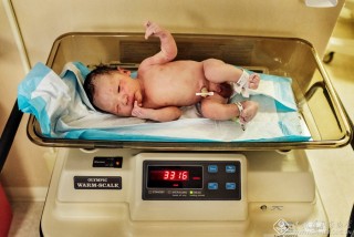 一个中国孕妇刚刚在洛杉矶罗兰岗惠提尔医院里产下一名男婴,孩子被放在秤上称重。
