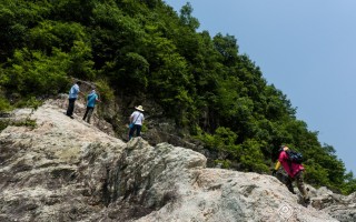 中国水利摄影家协会摄影家拍摄引汉济渭工程,考察汉江河道,山路崎岖。