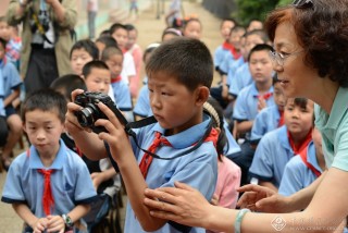 通信摄协为山里的孩子捐赠了数码相机,图中这位同学第一次举起了照相机。