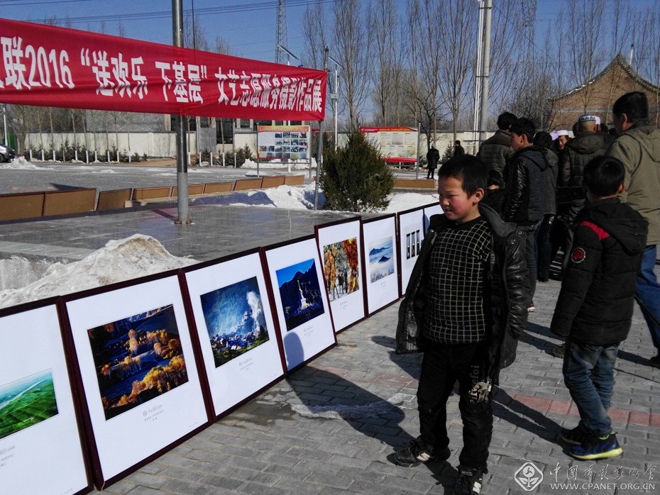 送欢乐下基层文艺志愿服务摄影作品展在同心县新华村和彭阳县玉洼村举办,图为村里群众观看展览。