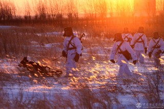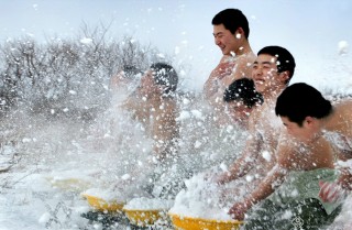 冬季,黑瞎子岛上的气候十分恶劣,官兵通过洗雪浴等办法提高抵御寒冷能力。(记者穆可双摄于2008年12月)