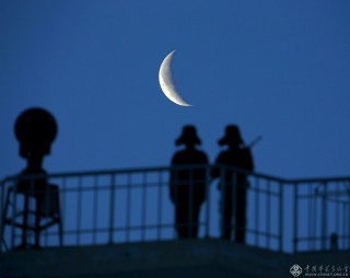 夜空中,一轮弯月悬挂在高高耸立的哨塔上空,与执勤哨兵构成了一幅美丽画卷。(记者穆可双摄于2016年2月)