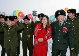 2008年12月30日,“东极哨所”排长郭晓明和山东姑娘孙晓丽的婚礼在哨所隆重举行。记者穆可双摄