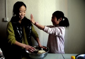 北京,褚爱红正在和面,调皮的小妹妹也想来捣乱。
