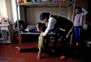 北京,来自玉树的藏族姑娘帮着褚爱红压腿。