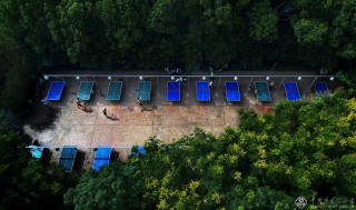 2017年9月9日,武汉市汉口江滩公园内,市民在树林中进行乒乓球运动。