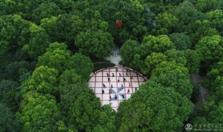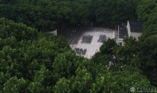 2017年9月22日,武汉大学校园内,2017级新生在树林中列队参加军训。