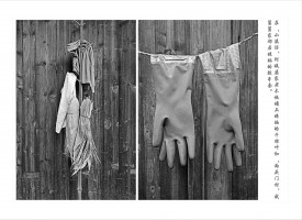 在“小溪沿”阿姨婆家老木板墙上晾晒的干棕叶和“两头门村”我舅舅家邻居晾晒的胶手套。