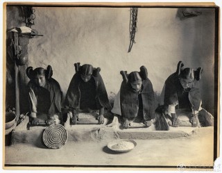 1906年左右,亚利桑那州四位年轻的霍皮族妇女在研磨粮食