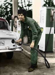 1961年,一名德国BP加油站员工为一辆汽车加油