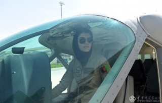 2015年,阿富汗第一位女飞行员Niloofar Rahmani在喀布尔坐在一架阿富汗固定翼飞机上
