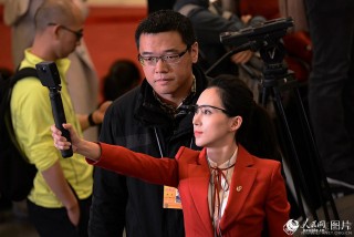 年3月5日,第十三届全国人民代表大会第一次会议在北京开幕。开幕会后在人民大会堂再次开启了“部长通道”,六位部长相继回答了记者提问。女记者用谷歌眼镜进行现场直播部长通道。人民网_