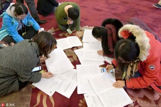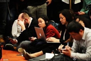 2018年3月5日,一群记者在人民大会堂伏地写稿,争取第一时间发出报道。