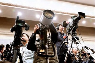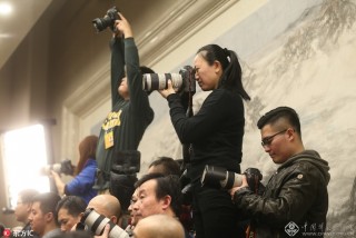 2018年3月2日,全国政协十三届一次会议新闻发布会在人民大会堂一层新闻发布厅召开,女记者相机聚焦发布会。