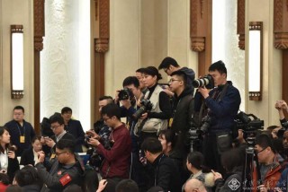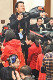 十三届全国人大一次会议新闻中心于3月7日15时在梅地亚中心多功能厅举行记者会,邀请扶贫办主任刘永富就“打好精准脱贫攻坚战”的相关问题回答中外记者的提问。女摄影记者等待拍摄时机