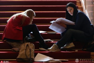 2018年3月5日,十三届全国人大一次会议于今天上午9时开幕,国务院总理李克强作政府工作报告。下午,各代表团举行全体会议,审议政府工作报告。阿拉伯女记者席地坐在楼梯上翻看采访提纲