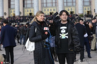 2018年3月5日,十三届全国人大一次会议于今天上午9时开幕,国务院总理李克强作政府工作报告。下午,各代表团举行全体会议,审议政府工作报告。外国媒体女记者大会堂前留影。