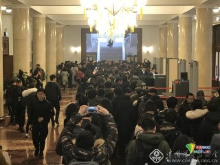 中国青年网北京2月28日电(记者吴楚卢冠琼)2月28日,全国政协十三届一次会议记者通气会召开。会后,众多记者在全国政协礼堂大厅内排队领取记者证,场面壮观。