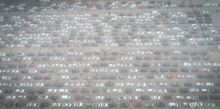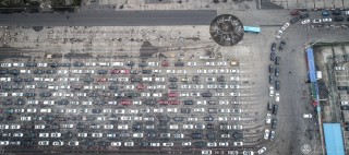 2018年2月25日,在海口市秀英港码头,受大雾影响的滞留车辆。
