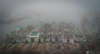 2018年2月25日,在海口市秀英港码头,港口受大雾影响全线封航,停航等待的客滚船。