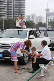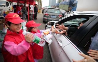 2018年2月22日下午,在海口新海港码头附近,两位小朋友志愿者热情地为沿途的车辆送上免费的饮料干粮等。