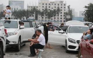 2018年2月24日,在海口市秀英港码头,海口三港正常通航后,滞留游客面带笑容在等待的情景。
