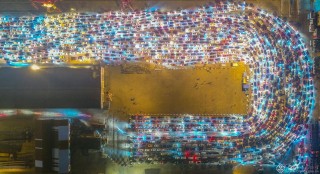 2018年2月21日22时许,在海口市秀英港码头,滞留车辆排长队有序登船离港。