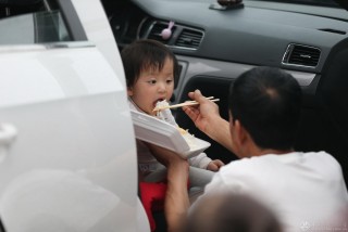 2018年2月24日,在海口市秀英港码头,一名滞留小游客吃上志愿者发放的晚餐。