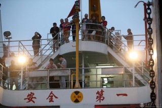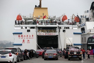 2018年2月24日,在海口市秀英港码头,登上船的游客开始离岛返家。