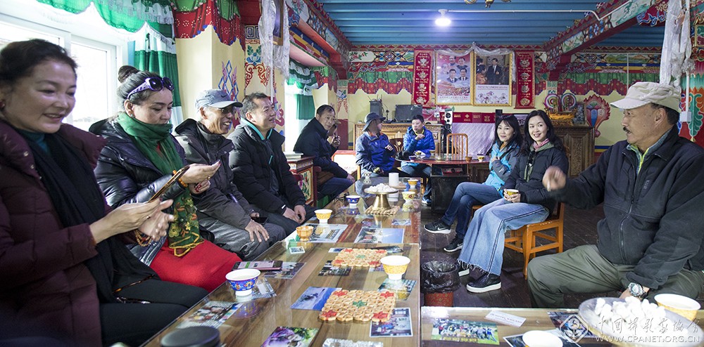 2018年4月1日西藏林芝错高村,来自内蒙古的导演巴音额日乐和演员巴德玛在和村民交谈。 吴砚华 摄