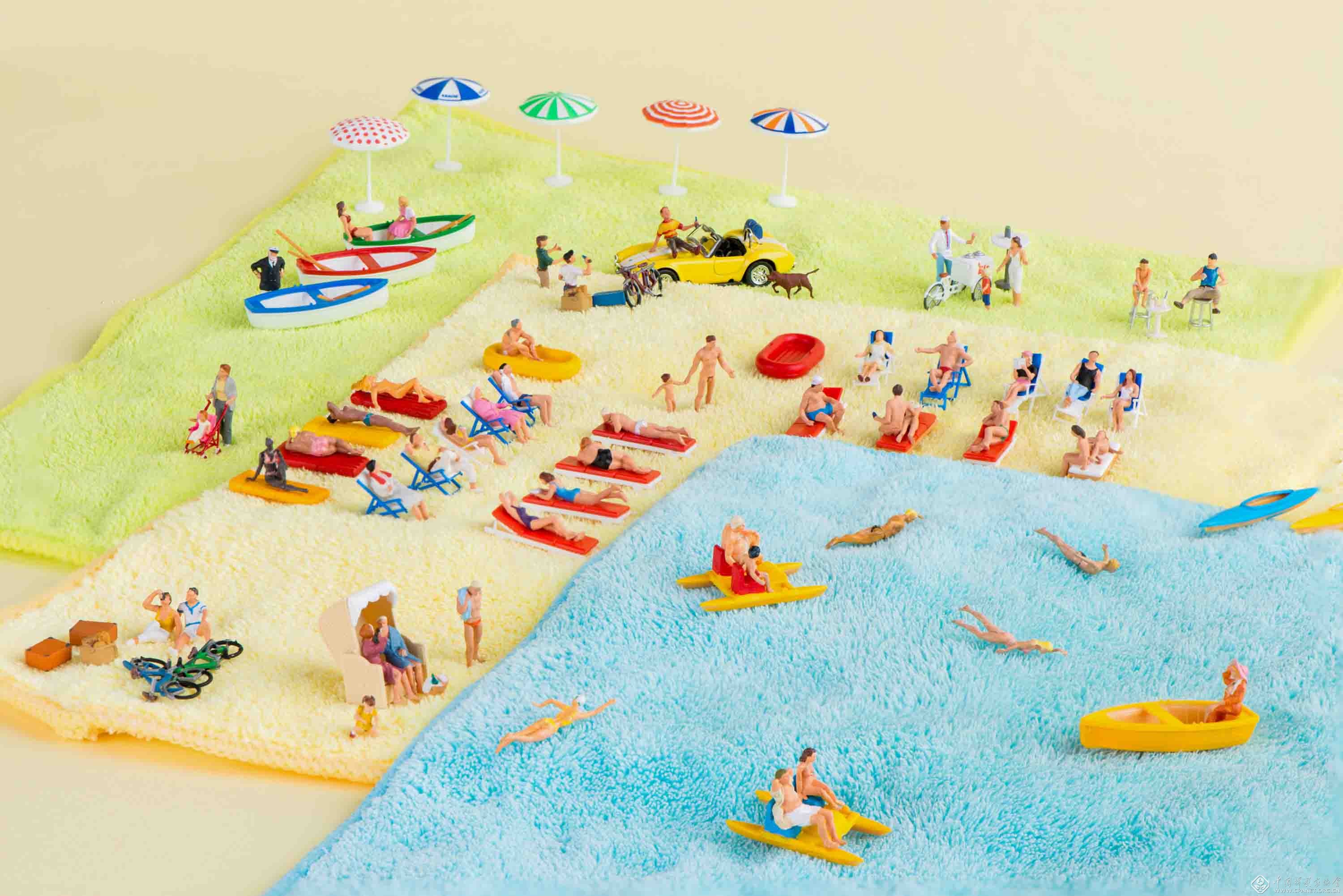 沈天旸——《小世界》——作品阐释: 通过摆放一群小人们的度假游乐场景,在趣味之外代入一份思考,代入对未来的期许,以及对于消费主义的警惕。