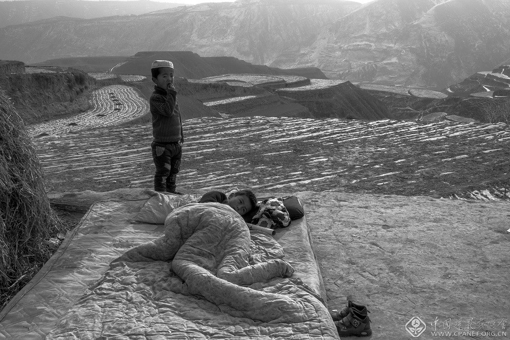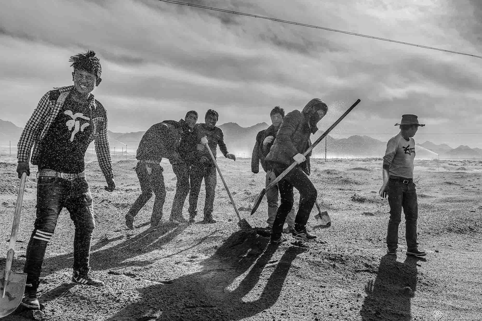 王伟涛——《高原治沙人》——作品阐释: 2014-2015年拍摄于西藏日喀则市江当乡。这里有8000亩沙漠,护林员要种植柳树和其他抗旱植物,五年后树活了,他们就可以离开。植物的存活率很低,可是他们从没有放弃过。