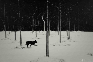 赵哲——《春雪》——作品阐释: 2018年春,上海初雪,傍晚在林中散步,一只小狗跟在身后,偶尔轻叫几声。如刘长卿所写:柴门闻犬吠,风雪夜归人。