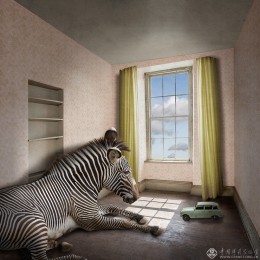 努力地用墙纸营造一种貌似自然的景观,在那被人类造出来的“自然环境”中,呈现在我们眼前的是一个个病态的带着哀伤神情的动物肖像。第一次看到这组作品时,让我有一种想哭的感觉。那庞大的身躯处于斗室的无奈,望向窗外蓝天白云的向往眼神,在狭小的浴缸中蹚水的大鸟,让狗熊在沙发上玩球……它们哀伤的眼神告诉我们,离开了赖以生存的自然环境,没有了自由,它们并不快乐!人类努力给动物营造一个自认为良好的生存空间,却成了真正扼杀其快乐乃至生命的凶手,这是一种多么具有讽刺意味的事实!