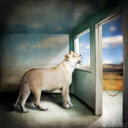 在我的每一张照片中,一只动物被从它的自然环境中移走,放置在一个不属于它的人类空间里。从动物的表情和监禁中,可以清楚地看到其他地方的渴望。褪色的壁画暗示了驯化的历史,我们常常愚弄自己,认为动物是我们自己的需要和情感的延伸。这些动物不在家。尽管如此,在他们的孤立中还是有一种令人不安的美。