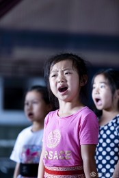 任思安今年4岁,是评剧娃娃中年龄最小的,休息期间在复习唱段。