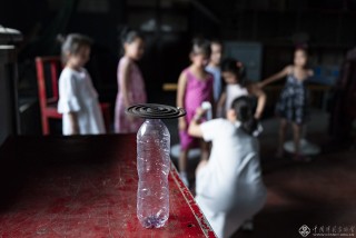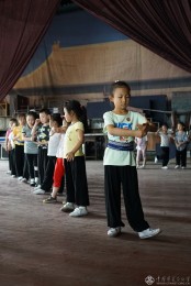 7岁的姚美金学评剧半年多,休息期间喝点热水补充水份。