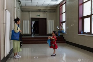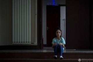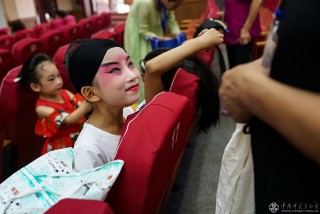 张艺苧在化妆间外休息,她5岁的时候荣获第十九届中国戏曲小梅花金奖。