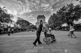 钟鼓楼广场恢复整治工程初见成效,一个年轻人推着母亲到这儿来感受一下广场的变化。
