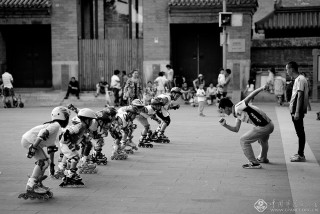 孩子们在学习滑旱冰。经过改造后,钟鼓楼广场更加干净、整洁,吸引了许多人在这儿玩耍。