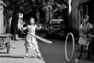 玩呼啦圈的小女孩。无论何时何地,孩子们总能找到自己喜欢的游戏。