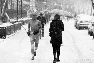 大雪纷飞,老人穿着短裤奔跑在街上。不是标新立异,冬练三九,夏练三伏,这是爱好运动人遵循的习惯。