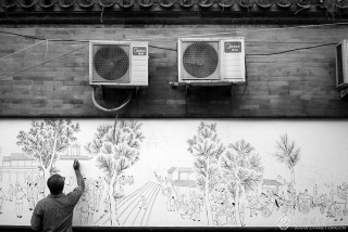 画师谢先生在创作壁画《国泰民安》,创作灵感来源于钟鼓楼。据谢先生说,他曾在后海酒吧街给多家酒吧创作过大型壁画,在这一带颇有些名气。