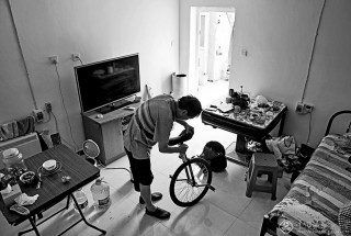 范来斌在家里归置他的独轮车。前不久,刚刚享受到“棚改”政策,他翻修了自己和兄弟范来勇的房子,家还没收拾利落就开始归置起他的独轮车。这辆车是他从网上花了300多元钱买的,比他小时候玩儿的车先进多了。买下它并没想重拾旧时的手艺,为的只是留个念想。他6岁开始玩儿车,玩儿了二十多年。