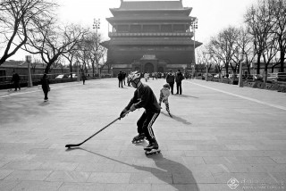 酷爱运动的赵守千带着8岁的孙子练习打旱冰球。75岁的老赵年轻时是什刹海冰场上的常客。
